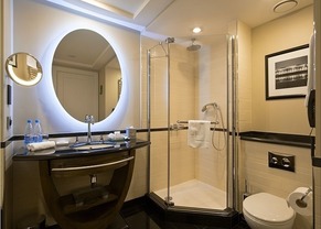 Самое распространенное сантехническое решение в гостиницах — установка душевой. Предпочтительно использовать кабину с низким поддоном достаточной площади, которая обеспечит хорошую эргономику душа. Такие модели универсальны и удобны для большинства пользователей. Часто вместо кабины оборудуют душевые зоны, не имеющие поддона, со встроенным в пол трапом. В этом случае зона отделяется непрозрачной стеклянной перегородкой.